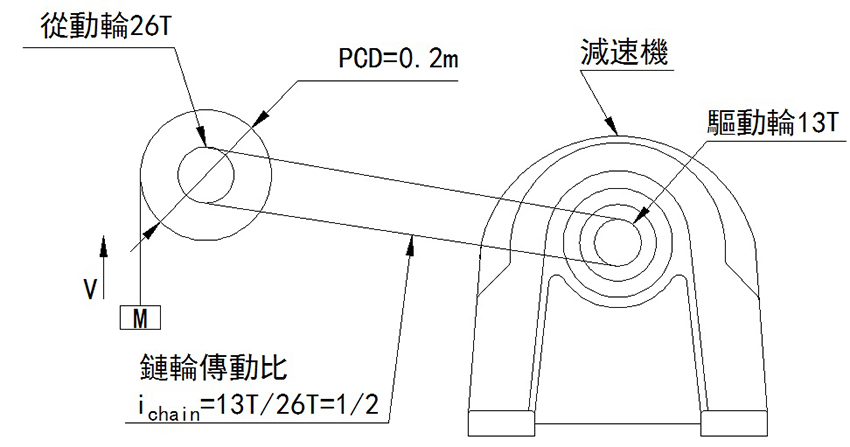 搬送速度;V=9.5m/min 鏈輪傳動效率:η1=1 減速機傳動效率:η2=0.9 運轉(zhuǎn)時間:2小時/日 啟動次數(shù):1回/分,中沖擊 使用電源:三相220V,50Hz 計算;一、減速比 由入力回轉(zhuǎn)數(shù)及出力軸回轉(zhuǎn)數(shù)來選定減速比 1、先求出輸送帶滾輪回轉(zhuǎn)數(shù)(N1) 1.N1=V/(PCD xπ) N1=搬送速度/(滾輪直徑PCD·π) =9.5/(0.2 x 3.14)=15r/min 2、再求出減速及出力軸回轉(zhuǎn)數(shù)(N2) 2.N2=N1/ichain N2=N1/鏈輪齒數(shù)減速比 =15/(1/2)=30r/min 3.以三相機60Hz的馬力計算減速比 3.i=30/1500=1/50 i=出力軸回轉(zhuǎn)數(shù)/入力軸回轉(zhuǎn)數(shù)(電機轉(zhuǎn)數(shù)) 二、扭力 決定減速比后,由使用機械工作條件計算減速機出力軸扭矩 1、先計算出輸送帶滾輪之扭力(T1) 1.T1=M·PCD/2 T1=M·PCD/2 =300x0.2/2=30kg.m 2、再換算成減速機出力軸所需扭力(N2) 2.T2=(T1·ichain)/( η1·η2) T2=(T1·ichain)/(η1·η2))=(30x0.5)/(1x0.9)=16.7kg.m 三、負(fù)荷條件 1.根據(jù)運轉(zhuǎn)條件算出修正后的扭力(T3) 1.T3=T2·K T3=T2·K =16x7·1 (系數(shù)K無沖擊時=1,沖擊越大,K值越大)=16.7kg.m 四、馬力 1.最后算成馬力(Hp) 1.Hp=(T3·N2)716.2 Hp=(T3·N2)/716.2 =(16.7x30)/716.2=0.7Hp……(3/4Hp) 摩擦系數(shù)表